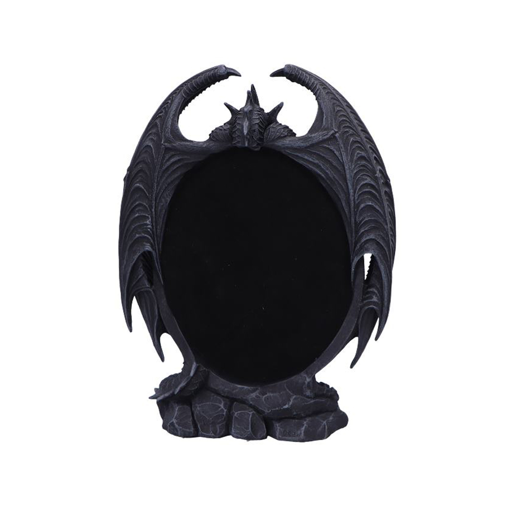 Harness the mystical allure of dragons with our Scaled Reflection from Nemesis Now’s premium collection, a 30cm masterpiece that merges functionality with fantastical aesthetics. Crafted from high-quality resin, this unique piece features a dragon enveloping a small mirror within its protective wings. The dragon’s claws and tail steady the mirror atop a rock-covered floor, creating a captivating and functional work of art. Meticulously painted in sleek black, the dragon’s piercing red eyes add a touch of intensity to the piece. Ideal for enthusiasts of mythical creatures and those seeking a blend of fantasy and practicality, the Scaled Reflection stands as a majestic addition to any collection. Explore our diverse range of dragon-themed giftware, each piece crafted to infuse your space with the magic and wonder of legendary creatures.